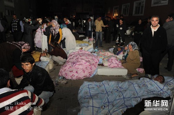10月23日,在土耳其东部凡省,灾民露宿街头。据土耳其道安通讯社23日报道,到目前为止,土耳其东部凡省地震已造成85人死亡、500多人受伤。