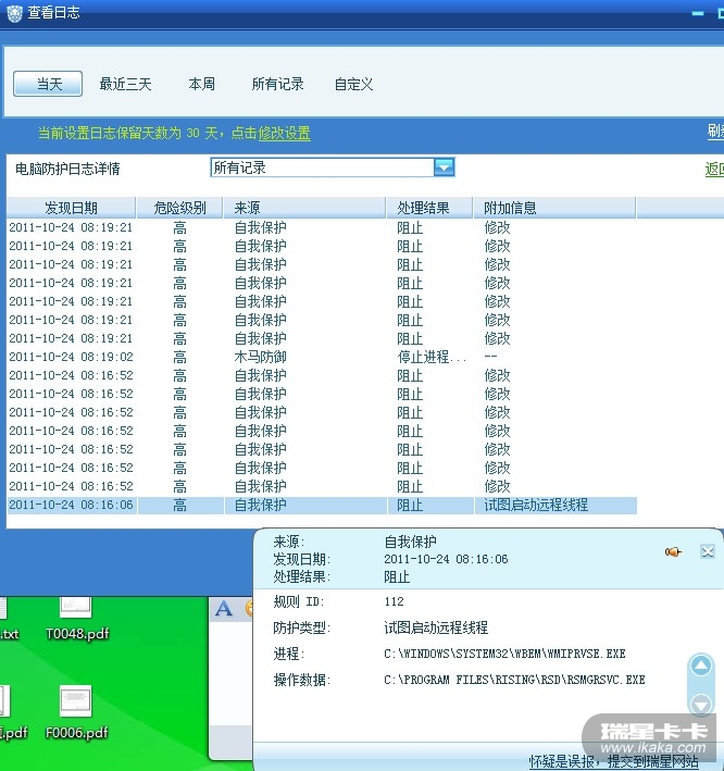 我的是HP预装的win7家庭普通版,上周升级到旗舰版,今天早上开机瑞星就提示启动远程,后来程序自动拒绝了。附件是日志和文件,下面是按照日志上显示每一个详细说明。请高手帮忙看看是什么问题。