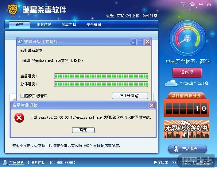 从官网上下载的瑞星,安装后不能正常升级。提示下载文件出错,建议其他时间段升级。试了三天了,都不行。