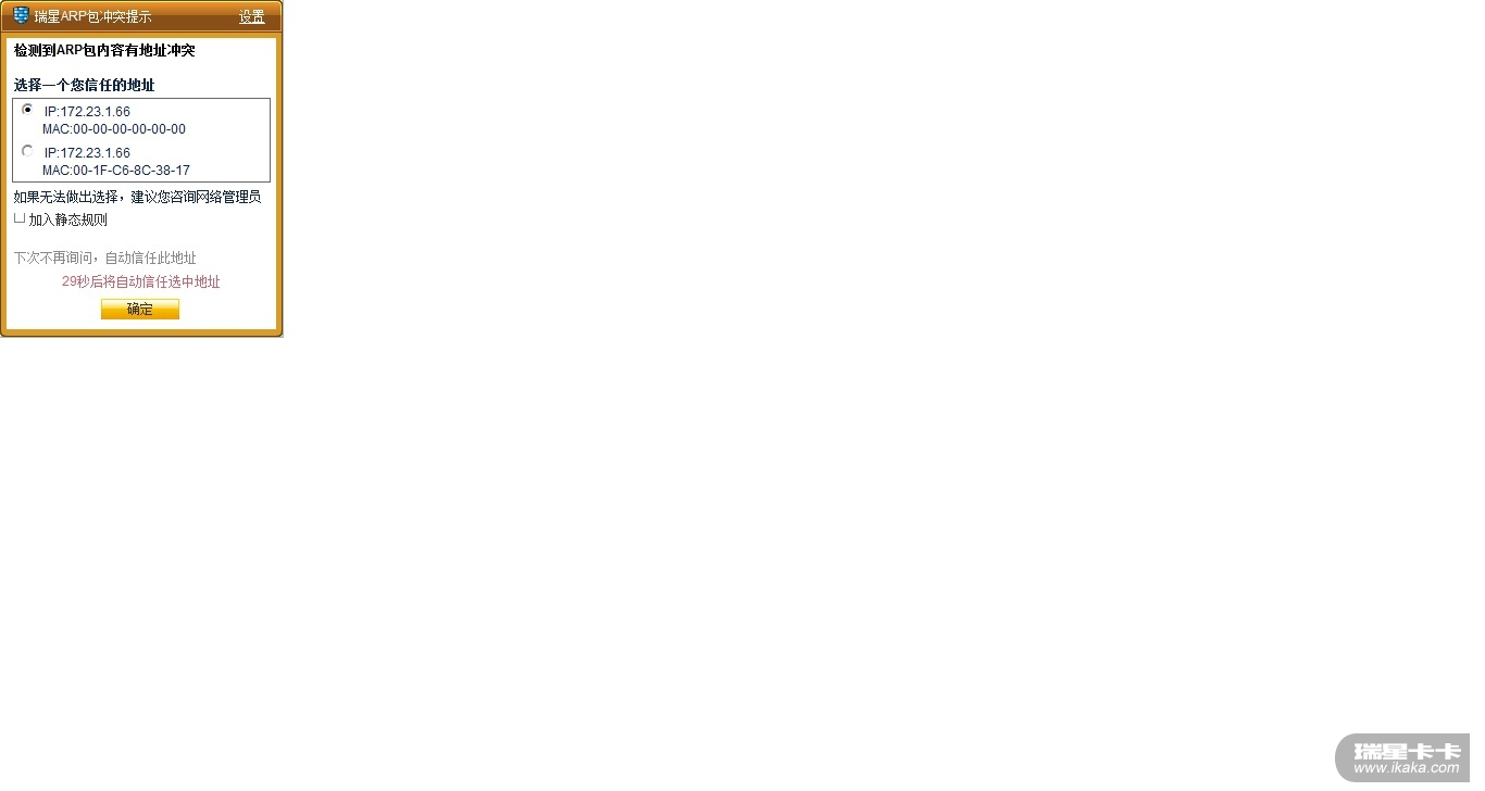 如何解决呢,不断弹出瑞星ARP包冲突提示