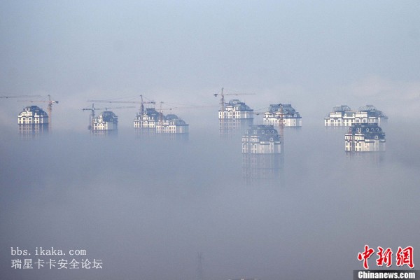 11月6日,哈尔滨市出现大雾天气,主城区雾较小,城市周边雾大,一些高楼楼身在雾中,只露楼顶,呈悬浮状,如童话里的世界。
