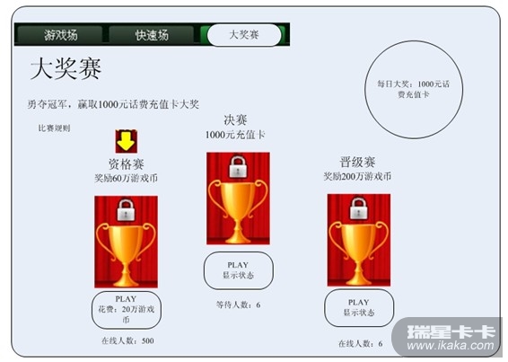 3,拥有晋级赛入场券的玩家可以在每日20:30进入晋级赛比赛;第一名奖励200万游戏币,并获得决赛入场券;决赛入场券每人每天只能最多拥有一张;4,每日决赛开启时,决赛场、晋级赛场关闭进入;已经在晋级赛的玩家牌局继续进行,但不再获得今日决赛入场券;5,决赛场产生第一名并获得1000元手机充值卡大奖;今日比赛结束;全服通告!参赛时间:1,