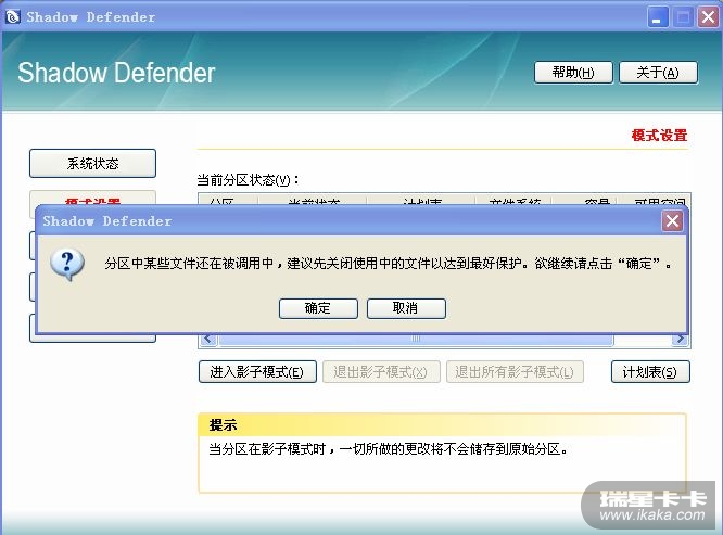 第一个图片是软件使用的情况,会出现这个界面,第二个图片是我用UNLOCKER软件发现D盘被瑞星助手锁定,需要非常长的时间才能自动解锁,然后才能正常使用影子系统。