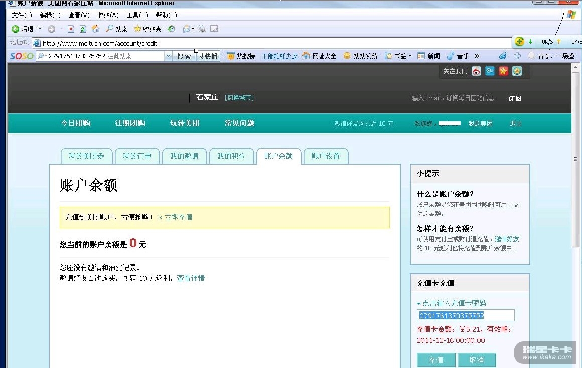 前几天参加了你们那个注册得积分的活动,然后用所得的积分在你们的网页上领了美团网的优惠券,当是是写着有效期到2011年12月16日,可就在我刚才准备使用的时候却提示已过期,到底是瑞星在忽悠我们用户还是美团在忽悠瑞星,请管员给个说法!!!!!我有截图,你们自己看清楚!这是当天使用掉的一张