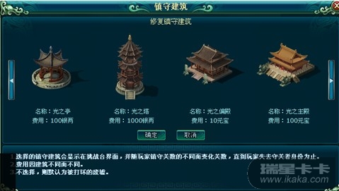 选择的镇守建筑会显示在挑战台界面,并随玩家镇守关数的不同而变化关数,直到玩家失去守关者身份为止。不选择,则默认为被打坏的废墟。