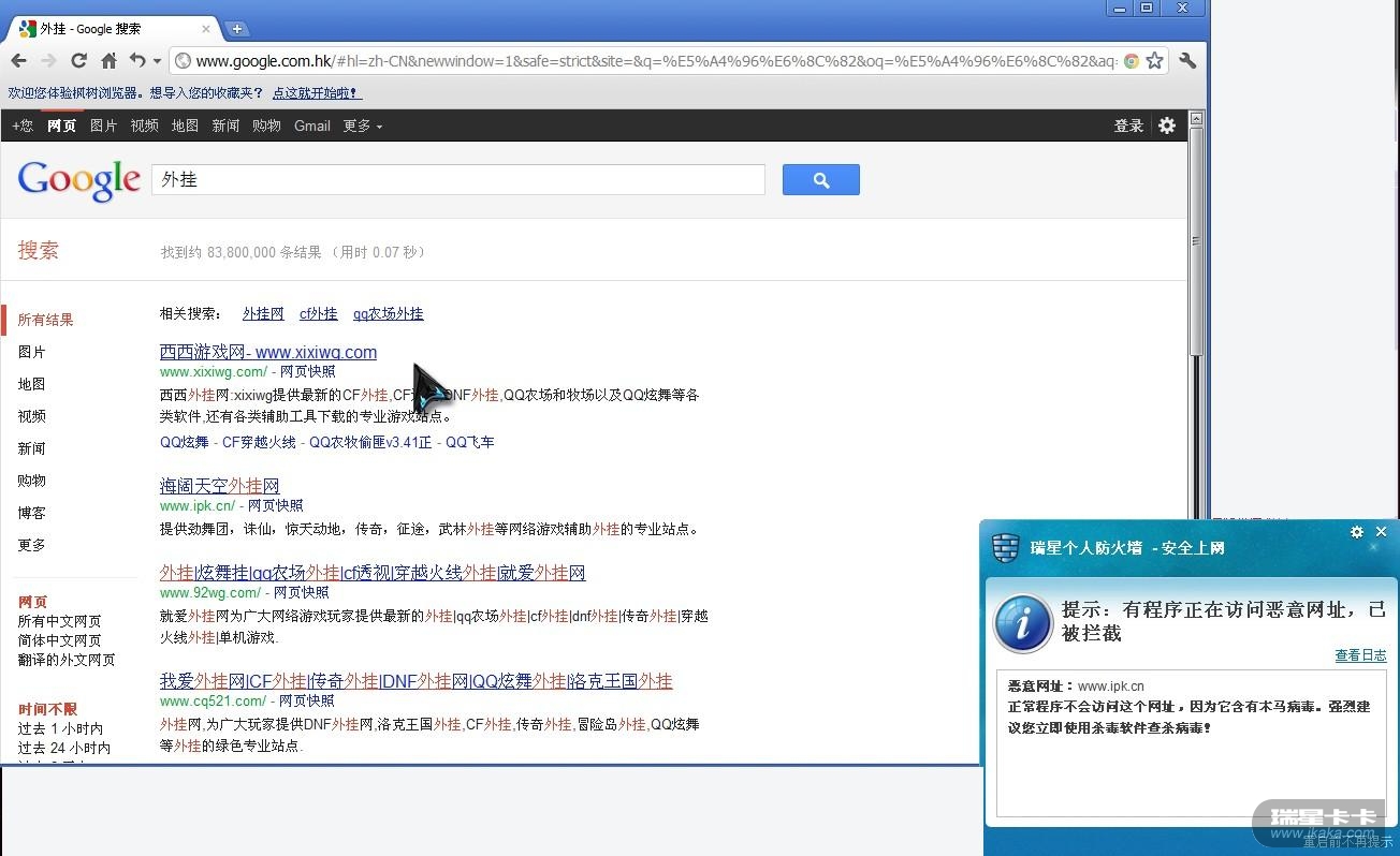 我在GOOGLE中搜索“外挂” RFW2012立马提示恶意网址拦截