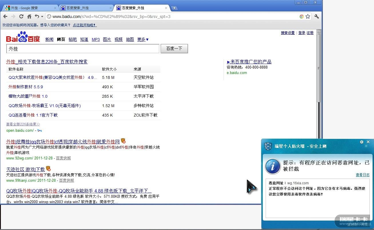 更确切的说,我在GOOGLE和BAIDU输入 外挂 点搜索后 在GOOGLE BAIDU显示搜索结果的同时防火墙就弹出恶意网址拦截了!