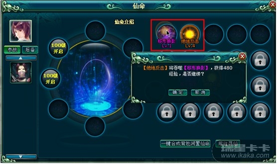 玩家拖动仙命到仙命装备格中可以进行装备,每个角色