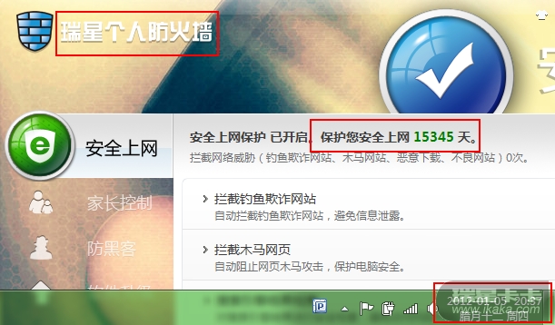 我电脑上的瑞星防火墙是今天下午才安装的,但是主界面上显示“安全上网保护 已开启。保护您安全上网15345天”,截图在附件中: