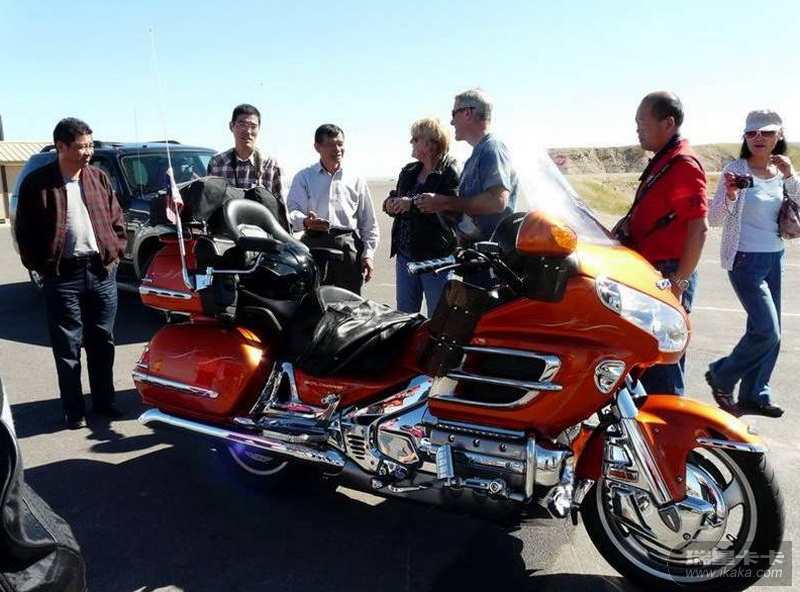 公园路边来了一辆漂亮的摩托车引起众人围观
