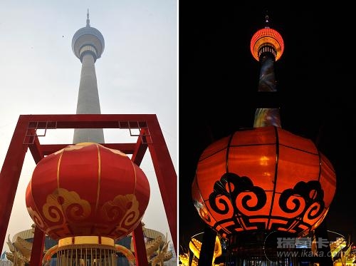 这是1月15日白天和夜晚拍摄的中央电视塔东广场的巨型贺岁红灯笼(拼版照片)。名为“龙啸四方丰盈灯”的巨型贺岁红灯笼近日亮相位于北京市西三环中路的中央电视塔东广场。据介绍,该灯笼高7.5米,取“祈福”之意,宽6米,四周配以“鸿运门框”,并将音响系统置于灯内,循环播放歌曲《歌唱祖国》。巨型灯笼与中央电视塔塔身“高悬灯笼造型”主体形象上下呼应,声光电一体的设计效果,为即将到来的新春佳节营造出浓浓的喜庆氛围。新华社记者 鲁鹏 摄