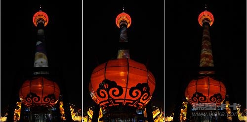 这是1月15日夜晚拍摄的中央电视塔东广场的巨型贺岁红灯笼(拼版照片)。塔身投影图案富于变化
