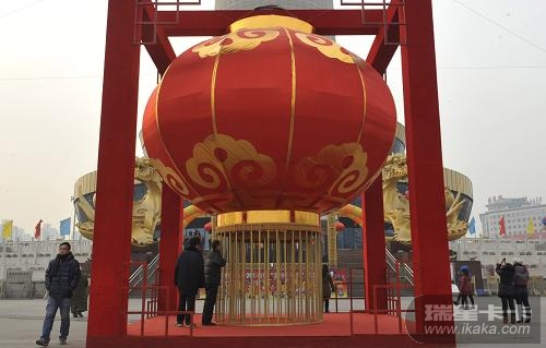 1月15日,游客在中央电视塔东广场上观赏巨型贺岁红灯笼