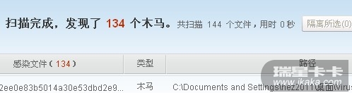 用了卡饭上的一个包测试瑞星,瑞星kill 61 X,安全助手:134X,差距好大啊,看来瑞星的云有希望了!!!