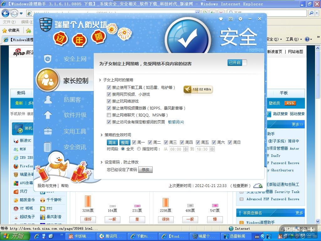 我的瑞星防火墙2012去年就设置了家长控制的,今晚我只是下载了WIN清理助手,本来想把防火墙的家长控制改过来的,没想到不用改也能下载啊。这样就截图上传反映了。