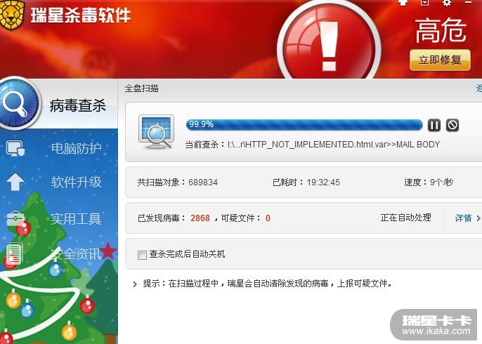 终于用卡巴斯基解决了,瑞星还是需要提高一下的。不需要格式化,用卡巴斯基全盘查杀就搞掂了。谢谢大家