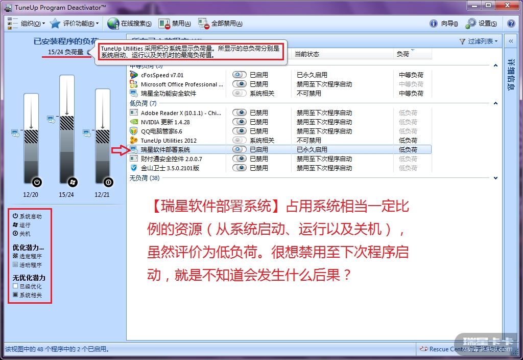 瑞星软件部署系统是负责瑞星所有软件管理的,楼主最好不要禁止这项,否则会导致瑞星软件使用异常。