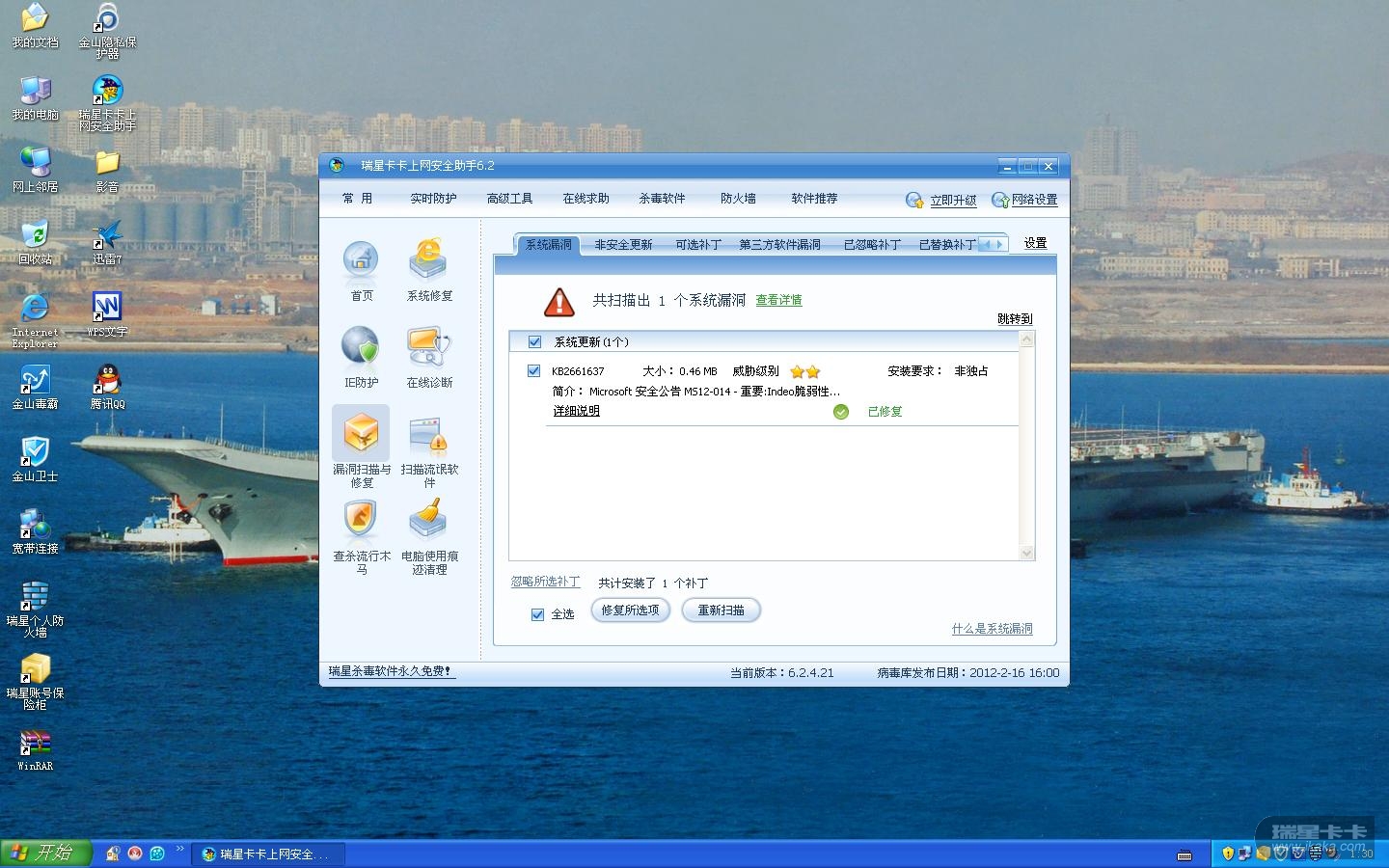 居然没有版主或大虾回复???这问题很复杂。。。还是很简单捏???俺现在无论用卡卡还是卫士依然还是打不了这个补丁啊~~~求助啊~~~:kaka4: :kaka4: :kaka4: 我是XP SP3系统,IE6,卡卡是6.2.4.21,病毒库是2012-2-16下午16:00的。