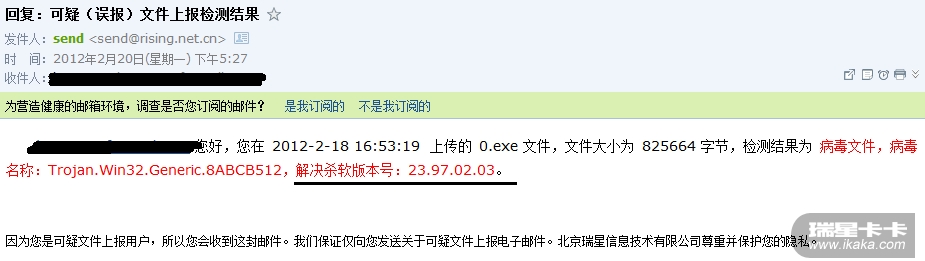 您收到的邮件中23.97.02.03这个版本是病毒库版本号,23.00.56.15是杀毒软件主程序版本号。