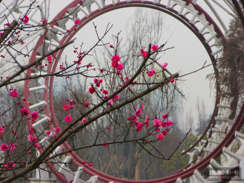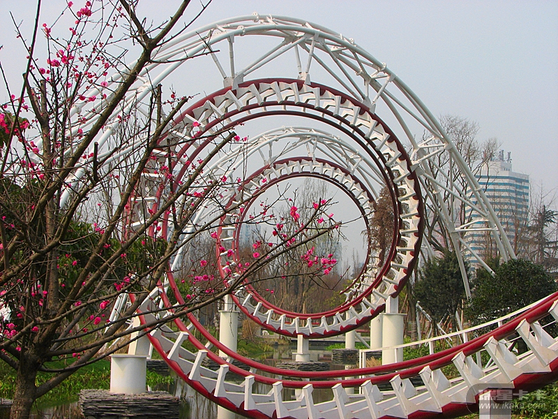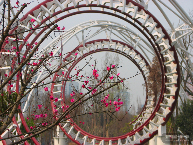 梅花之类的很难形成花海,如无花海当精雕细琢,选一支,有花三五朵,让自己靠的足够近,让光圈足够大,背景的过山车虚化后会是很好的东西。待到天气晴朗时值得再试拍几次。