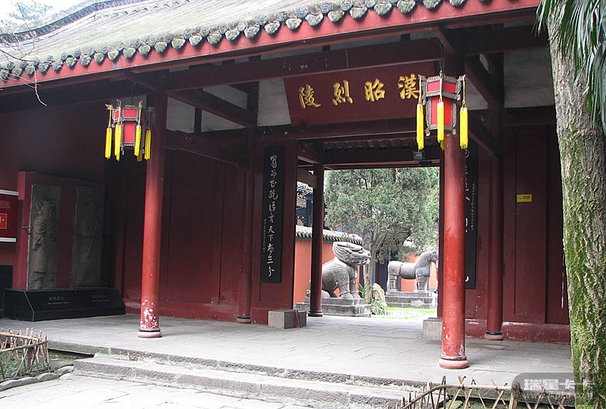 “汉昭烈陵”是三国时蜀国开国皇帝刘备的陵寝,史称“惠陵”,位于成都市武侯祠内。陵墓占地2000平方米,封土高12米,有一道180米长的砖墙环护。陵前有“汉昭烈皇帝之陵”碑,清乾隆五十三年(1788年)立。史载,刘备于223年4月病逝于今重庆市奉节县的白帝城后,由蜀国丞相诸葛亮运回成都,于当年8月安葬;刘备的甘、吴二位夫人也合葬于此墓中。刘备墓现有门匾“汉昭烈陵”及“千秋凛然"对联:“一杯土尚巍然,问他铜雀荒台何处寻漳河疑冢;三足鼎今安在,剩此石鳞古道令人想汉代宫仪”。
