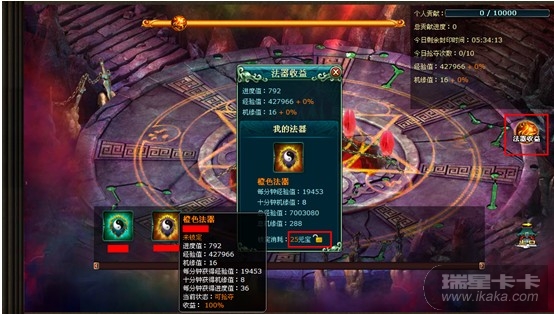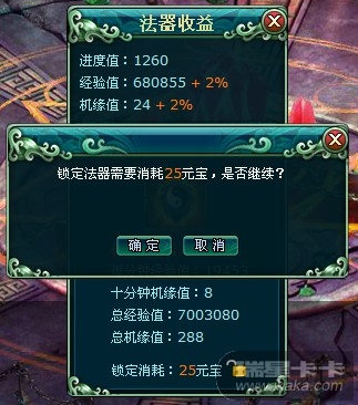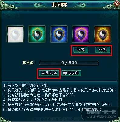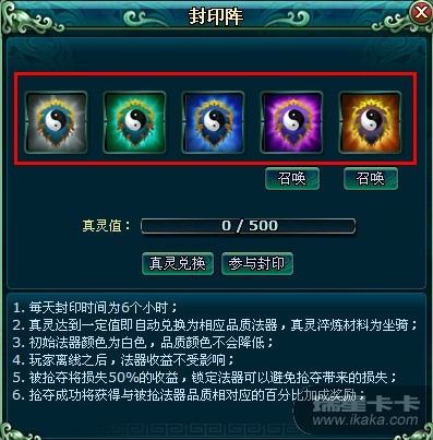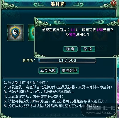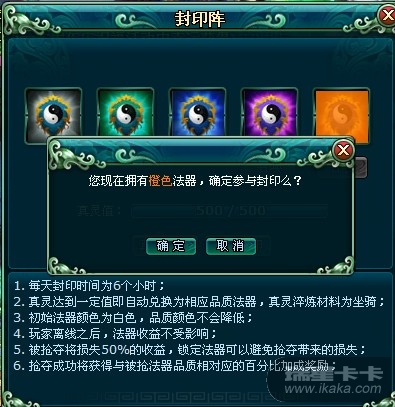 封印规则: a) 每位玩家每日可封印一个法器; b) 每个法器的封印总时间为6小时,封印时间内玩家下线也会累计时间,也能获得封印收益; c) 法器封印满6小时后,将自动消失; d) 今日未封印完的法器次日可以继续封印,时间结束后可以正常开启第二天的封印; e) 封印过程中,玩家将每分钟获得相应的经验; f) 封印过程中,玩家将每10分钟获得相应的机缘值; g) 封印的法器品质越高,获得的经验、机缘值更高;