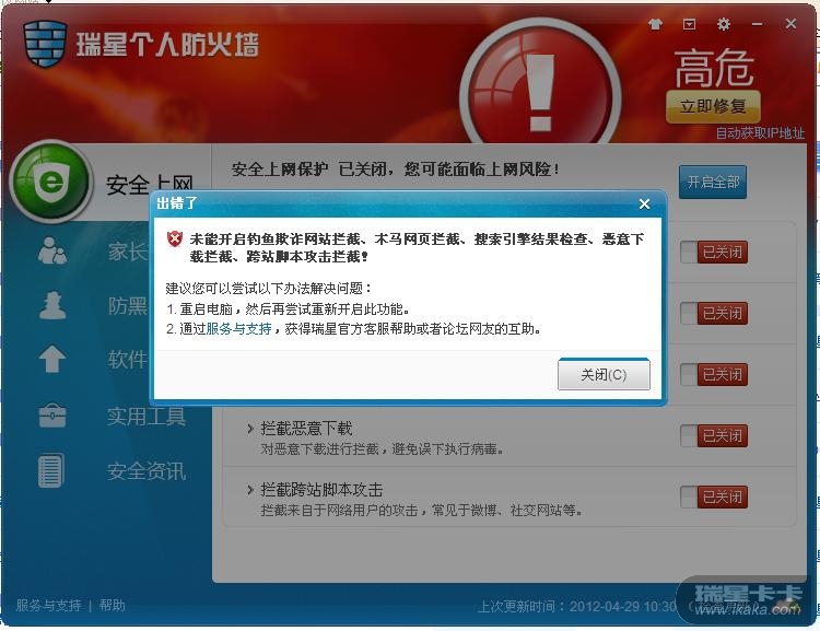 首页 » 个人产品讨论区 » 瑞星个人防火墙V16 » 安全上网保护无法开启