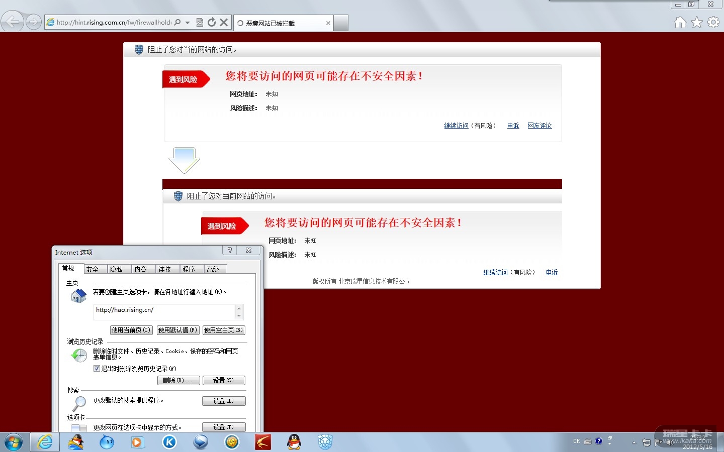 本地RFW 23.00.29.21 版本测试hao.rising.cn已不拦截,请将瑞星升级至最新版本。