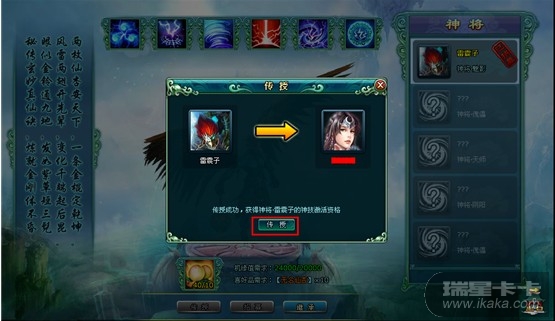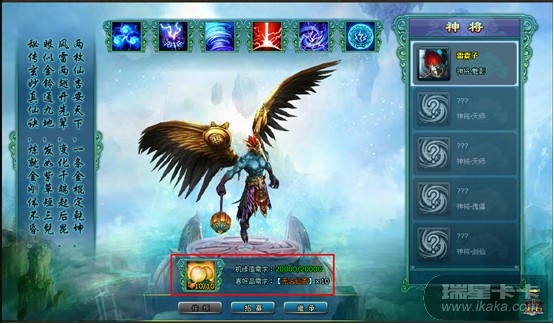4、当玩家主角职业与雷震子相同,可通过传授功能把神将技能激活资格传给主角(包括被动技能),在源灵城——中心广场——白欢——神将招募处可以进行传授;