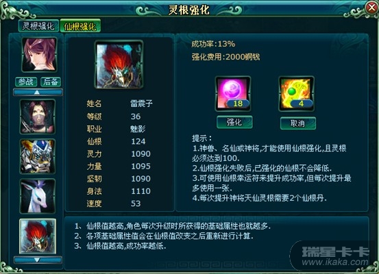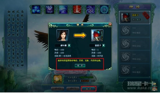 1、玩家可通过继承功能,把除主角外的名仙或神兽的等级,灵根,龙脉,境界丹、仙魂和技能等级传给神将;
