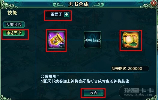 4、 神将天书=天书残卷*5+神将喜好品*1+铜钱*200000;