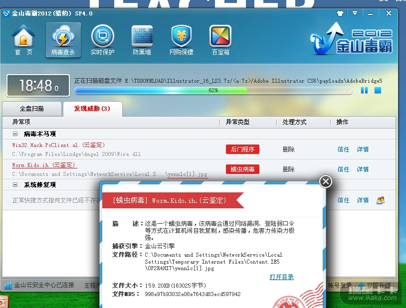用2012金山毒霸的猎豹查杀。说瑞星的修复lnk被修改。RsStub.exe文件被病毒感染。(猎豹的病毒隔离区不知道在那里。没有找到文件。)