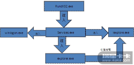 此次瑞星公司公布的病毒分析报告显示,“超级火焰”病毒的主体为一个名为MSSECMGR.OCX的DLL动态库,通过命令行“rundll32.exe MSSECMGR.OCX, DDEnumCallback”来实现病毒的加载。病毒运行后会将自身复制到System32目录下,并向services.exe、winlogon.exe、explorer.exe和iexplore.exe等程序中注入自身并实现加载。该病毒的注入流程如下图所示。