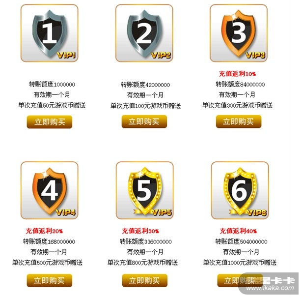 | 购买额度 | 赠送VIP | 充值返 点 | 转账额度 | 有效期 | 免费表情 | 银行功能 | 禁言 | 踢人 |