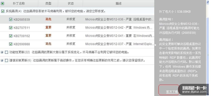 No1. 老版的卡卡上网安全助手漏洞下载可以设置为从微软官方下载和从第三方下载两种方式。可是现在新版的瑞星安全助手只有p2p下载一种方式。希望能够恢复从微软官方下载这种方式。