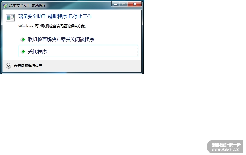 1.每次开机出现“瑞星安全助手 托盘主程序一停止工作”窗口,卡卡助手没有运行。双击桌面瑞星安全助手图标,还是出现相同的窗口。窗口中问题的详细信息如下: