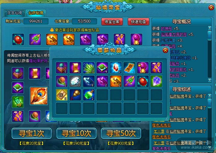 5:仙境寻宝中可能出现的一些物品以及寻宝1次、10次、50次的按钮,在按钮下方显示对应需要花费的元宝数量。区域