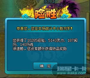 7.战斗结果有5种情况:完胜、险胜、平局、小败、完败,战斗结束时胜利方血量平均为50%以上为完胜,50%以下为险胜,对应失败方为完败、小败。战斗结束后弹出获得的奖励,如下图: