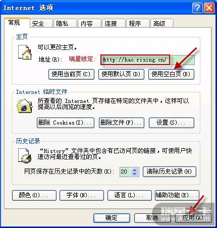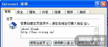 当您希望将http://hao.rising.cn/更换为其他IE主页时,您可以打开IE,点击工具——Internet选项页面的【使用空白页】按钮重新设置IE主页选项卡。
