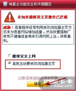 当您的浏览器主页修改完成后,如果瑞星杀毒软件在Windows 桌面右下角弹窗提示您风险“浏览器主页修改完成”您的浏览器主页已成功修改为“XX.XX.XX主页”(如图2所示),点击【确定修改】完成操作。