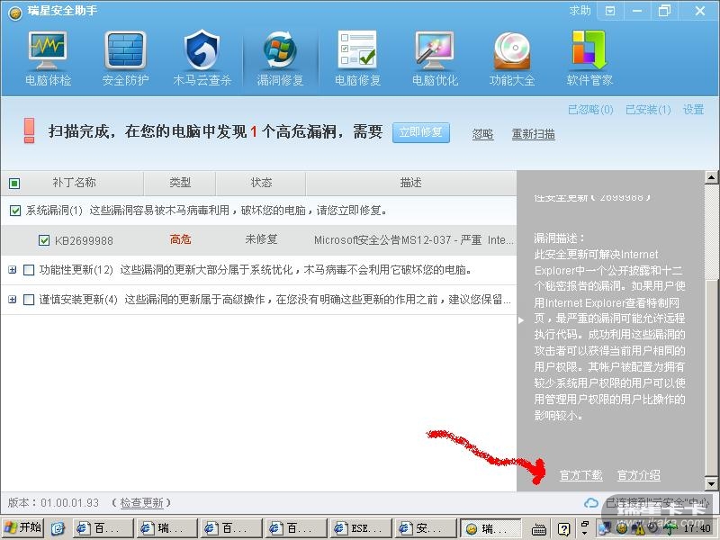 安全助手的漏洞修复界面,点向右的箭头,则会显示该补丁的详细介绍,并在下方给出该补丁的微软官方的下载地址。而这个地址不应该是你们瑞星的吧?:kaka10: