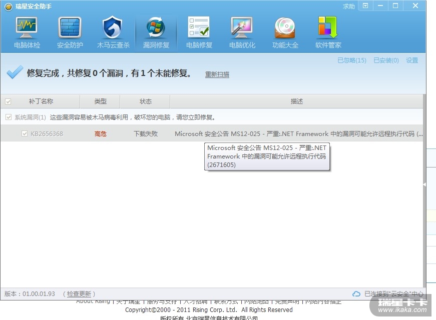 kb2656368 这个高危修复,瑞星修复不了(显示下载失败)。。我在网站下载了NDP40-KB2656368 可是瑞星还是检出高危。。。。。求助