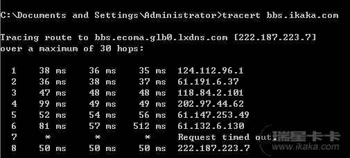 tracert bbs.ikaka.com的运行结果(开始—运行—输入cmd回车,输入tracert bbs.ikaka.com回车,运行完毕后截图保存)