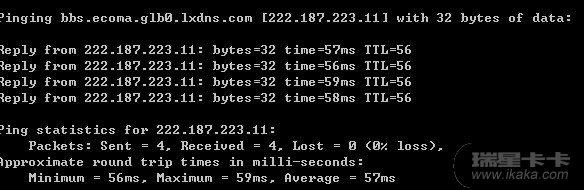 Ping bbs.ikaka.com的运行结果(开始—运行—输入cmd回车,输入Ping bbs.ikaka.com回车,运行完毕后截图保存)