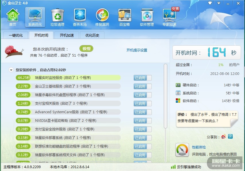 建议楼主暂时卸载金山卫士,单独安装瑞星观察有没有系统启动慢的问题。
