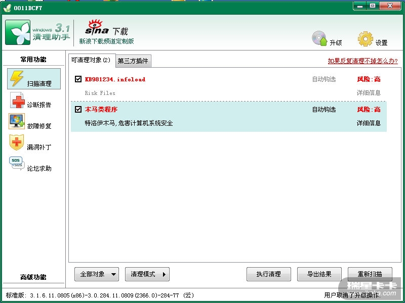 6、WINDOWS清理助手3.0可兼容WIN2000,但是启动提示异常,升级病毒库后,查杀无异常。没作用看着