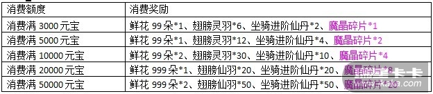 玩家若在【商城】、【仙境寻宝】、【神秘商店】及【天官赐福】消费满50000元宝,即可获得以上消费额度的所有奖励。温馨提示:以上奖励均为绑定物品,奖励以信函方式发放。四、