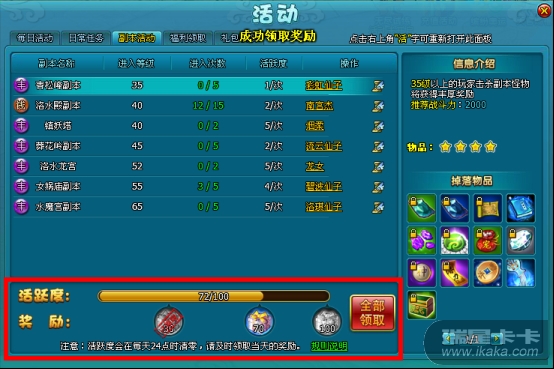 2. 应广大玩家要求,为减轻玩家游戏负担,优化副本/镇妖塔/洛水龙宫NPC对话面板,更清晰的显示副本的收益;