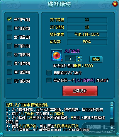 三.八门精纯功能简介:八门遁甲中每个门都有对应的精纯值,各门的精纯值越高,对应门的属性附加增强作用就越大。