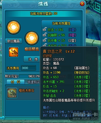 魔晶洗炼极品预览魔晶洗炼面板提供了同种魔晶的极品洗炼属性预览功能,如下图